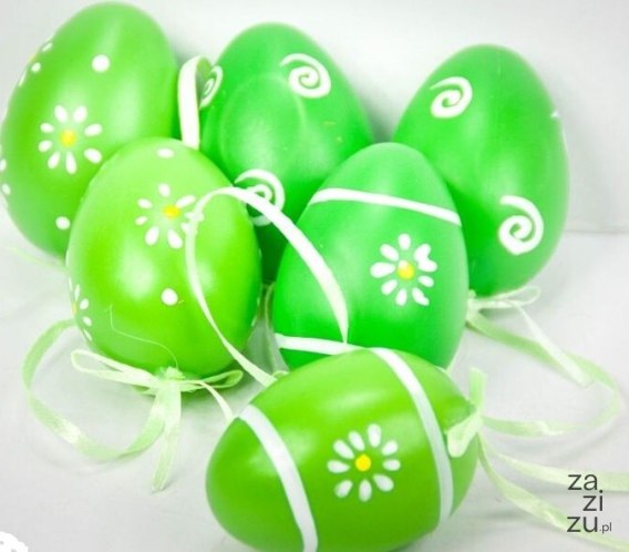 Zawieszane na sznureczku zielone pisanki 6 cm z wstążką. Świetnie nadają się do dekoracji domu na Wielkanoc. Piękne, wiosenne kolory ożywią każde wnętrze nadając mu świątecznego klimatu.