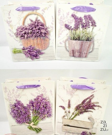 Torebki prezentowe wykonane z sztywnego i grubego papieru o dużej wytrzymałości, ozdobione na całej powierzchni nadrukiem z motywem kwiatów pięknej lawendy. Ten uniwersalny wzór pozwala zapakować do niej upominki na różne okazje. Każda torebka posiada wzmacniane dno oraz dobrze zamocowane sznurki/rączki. Opakowanie zawiera 12 szt. torebek w miksie 4 zbliżonych do siebie wzorów.